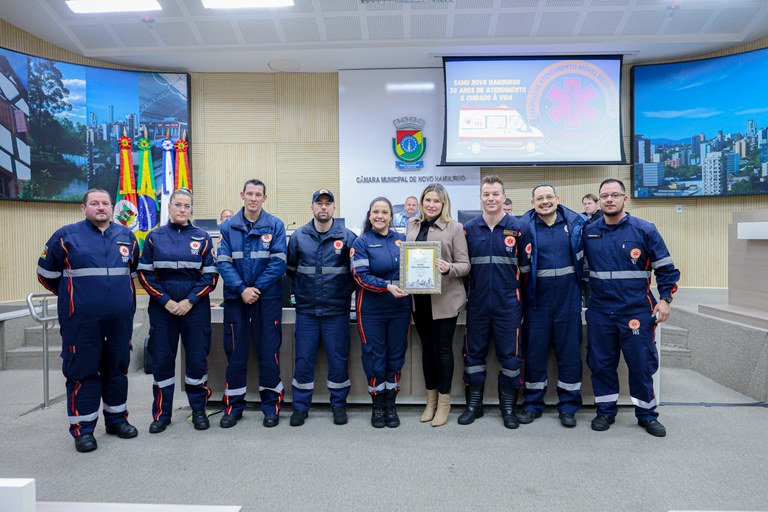 11/08/2025 – Em 2004, decreto assinado pelo presidente Luiz Inácio Lula da Silva instituiu no país o Serviço de Atendimento Móvel de Urgência (Samu). Após um período de adesão, estudos e organização, surgiria, no dia 1º de agosto de 2005, o Samu Novo Hamburgo. Em comemoração aos 20 anos recém-completados, a Câmara prestou uma homenagem a seus profissionais durante a sessão plenária desta segunda-feira, 11. O reconhecimento foi proposto pela vereadora Daia Hanich (MDB).